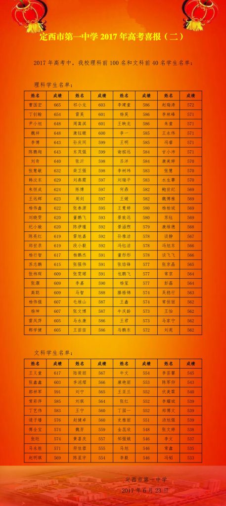 定西市第一中學(xué)2017年高考喜報(bào)(二) 時(shí)間:2017-06-23 分類:高考綜合改革 分享: 上一個(gè): 定西市第一中學(xué)2017年高考喜報(bào)(四) 下一個(gè): 部分高校來我校召開招生宣傳咨詢會 相關(guān)文章 凝心聚力開新局??奮力拼搏譜華章 緊跟高考改革步伐 促進(jìn)教師專業(yè)發(fā)展 云端相聚 受益匪淺 高考喜報(bào) 高考喜報(bào) 強(qiáng)化工作職責(zé) 熟悉工作流程 2017年—2019年高考捷報(bào)頻傳 定西市第一中學(xué)2018年高考喜報(bào)(四)