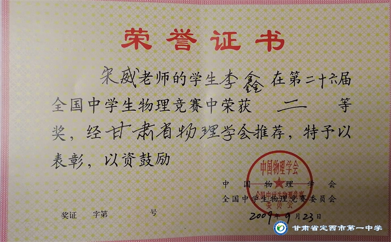 宋威老師在指導(dǎo)學(xué)生參加全國中學(xué)生物理競賽方面取得了良好成績。他所指導(dǎo)的學(xué)生中有二十多人次在全國中學(xué)生物理競賽中獲得國家級二、三等獎,其中有一人獲得省級一等獎。他本人也多次獲得“中國物理學(xué)會全國中學(xué)生物理競賽委員會”頒發(fā)的“全國中學(xué)生物理競賽優(yōu)秀指導(dǎo)教師獎”。