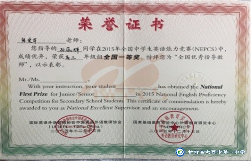 陳愛萍,定西市第一中學(xué)高級教師,英語教研組組長。1993年畢業(yè)于西北師大外語系,同年進入定西市第一中學(xué)工作。從教近30年,先后獲得“定西市骨干教師”、“定西市青年教學(xué)能手”、“全國中學(xué)生英語能力競賽優(yōu)秀輔導(dǎo)教師”等榮譽。