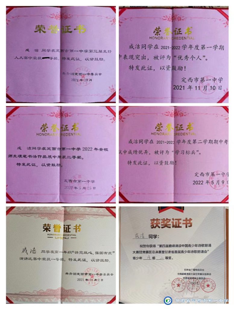 成潔同學(xué)興趣愛好廣泛,從小就學(xué)習(xí)繪畫、書法等,并熱愛文娛活動(dòng)。通過經(jīng)常性參與此類活動(dòng),鍛煉了她的身心,磨練了她的意志,陶冶了她的情操,她也在活動(dòng)中收獲了友誼。她積極參與學(xué)校的各種活動(dòng),2021年10月獲定西一中主持人大賽一等獎(jiǎng);2021年11月獲定西一中高一年級(jí)“請(qǐng)黨放心、強(qiáng)國(guó)有我”演講比賽一等獎(jiǎng);2022年5月獲定西一中全校師生硬筆書法作品展二等獎(jiǎng)。與此同時(shí),還參加一些校外活動(dòng),她曾在北京舉行的全國(guó)第三屆“巔峰誦讀”大賽總決賽獲青少B組金獎(jiǎng);在第四屆全國(guó)學(xué)生“學(xué)憲法講憲法”活動(dòng)甘肅省選拔賽演講賽中榮獲二等獎(jiǎng);定西市“消防安全伴我行”主題演講比賽中獲一等獎(jiǎng)……在成績(jī)面前,她從不驕傲,所謂山外有山,樓外有樓,她要求自己必須不斷努力,追求更高的目標(biāo)。