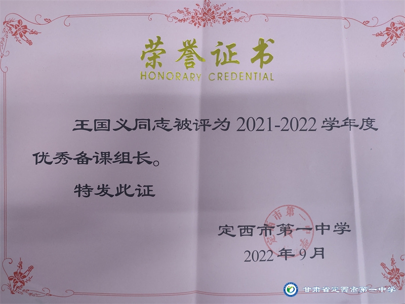 王國(guó)義,男,漢族,大學(xué)本科學(xué)歷,定西一中高級(jí)教師,從教27年始終在教育一線擔(dān)任歷史教學(xué)及班主任工作。默默無聞,潛心教書的他,從不爭(zhēng)榮譽(yù)的評(píng)選,只在用實(shí)際行動(dòng)回饋學(xué)校、家長(zhǎng)和學(xué)生。先后多次獲得市、縣、校級(jí)優(yōu)秀教師和優(yōu)秀班主任稱號(hào),并在教學(xué)活動(dòng)中多次擔(dān)任評(píng)委,真正踐行著“一棵樹搖動(dòng)另一棵樹,一朵云推動(dòng)另一朵云,一個(gè)靈魂喚醒另一個(gè)靈魂”的教育本質(zhì)。