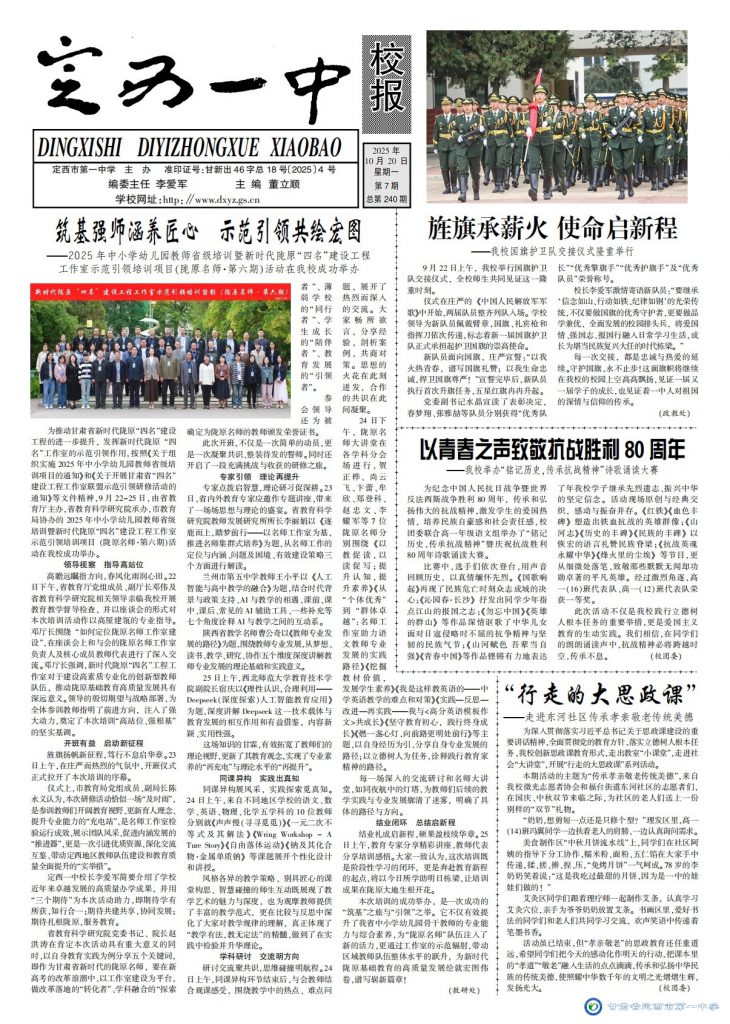 【“三抓三促”行動(dòng)進(jìn)行時(shí)】定西一中校報(bào)2025年第七期 時(shí)間:2025-10-20 分類(lèi):三抓三促/ 校報(bào)校刊 (撰稿:董立順 審核:王景龍 田永強(qiáng) 監(jiān)審:水晶 ) 定西一中校報(bào)2025年第七期下載 分享: 上一個(gè): 【“三抓三促”行動(dòng)進(jìn)行時(shí)】筑基強(qiáng)師涵養(yǎng)匠心 示范引領(lǐng)共繪宏圖 下一個(gè): 【“三抓三促”行動(dòng)進(jìn)行時(shí)】遇見(jiàn)教育 預(yù)見(jiàn)成長(zhǎng) 相關(guān)文章 【“三抓三促”行動(dòng)進(jìn)行時(shí)】喜報(bào)——我校學(xué)子在2025年全國(guó)中學(xué)生數(shù)學(xué)奧林匹克競(jìng)賽甘肅賽區(qū)聯(lián)賽中榮獲佳績(jī) 【“三抓三促”行動(dòng)進(jìn)行時(shí)】細(xì)耕常規(guī) 智研共進(jìn) 【“三抓三促”行動(dòng)進(jìn)行時(shí)】遇見(jiàn)教育 預(yù)見(jiàn)成長(zhǎng) 【“三抓三促”行動(dòng)進(jìn)行時(shí)】筑基強(qiáng)師涵養(yǎng)匠心 示范引領(lǐng)共繪宏圖 【“三抓三促”行動(dòng)進(jìn)行時(shí)】聚名師智慧 ?賦能備高考 【“三抓三促”行動(dòng)進(jìn)行時(shí)】定西一中校報(bào)2025年第六期 【“三抓三促”行動(dòng)進(jìn)行時(shí)】四省聯(lián)袂研考路 共繪備考新藍(lán)圖 【“三抓三促”行動(dòng)進(jìn)行時(shí)】喜報(bào)——我校教師在2025年全市中小學(xué)基礎(chǔ)教育精品課遴選活動(dòng)中榮獲佳績(jī)